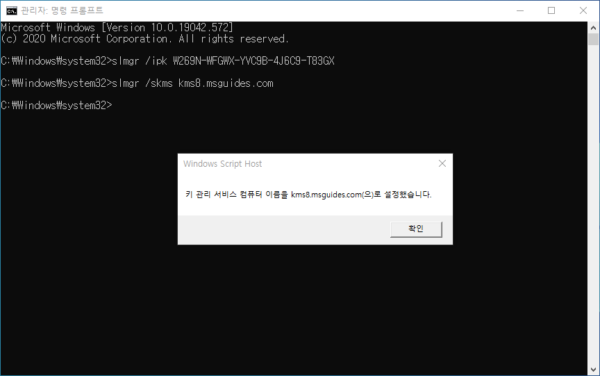 3. slmgr /skms 서버이름 - 키 관리 서버 설정