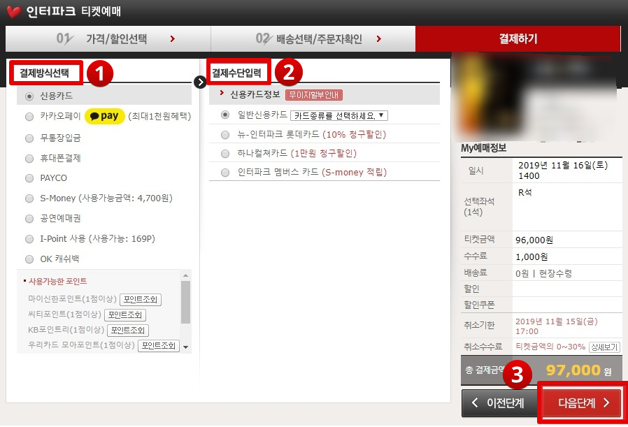 결제 방법에서 신용카드, 카카오페이, 은행계좌, 휴대전화 결제를 선택하고 결제 방법 입력에서 카드나 은행을 선택한 후 다음 단계를 누르십시오.