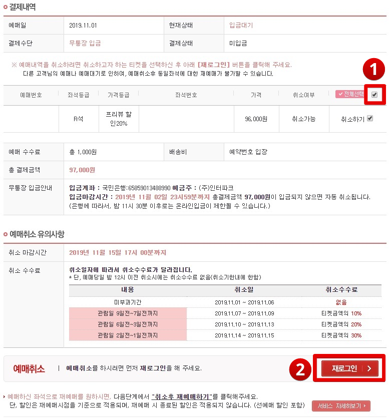 먼저 인터파크에 로그인하고 상단의 체크/취소 버튼을 클릭한다.