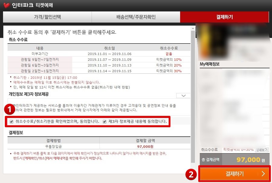 마지막으로 취소 수수료/취소일을 확인하고 제3자 정보 제공 및 언론 결제 등에 동의하면 인터파크 취소 후 예약이 완료된다.