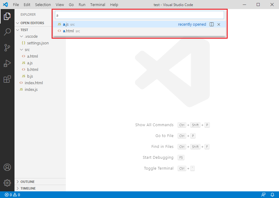 Go > Go to File 메뉴를 이용하거나, 단축키 Ctrl + P를 이용해 파일 검색창을 엽니다.