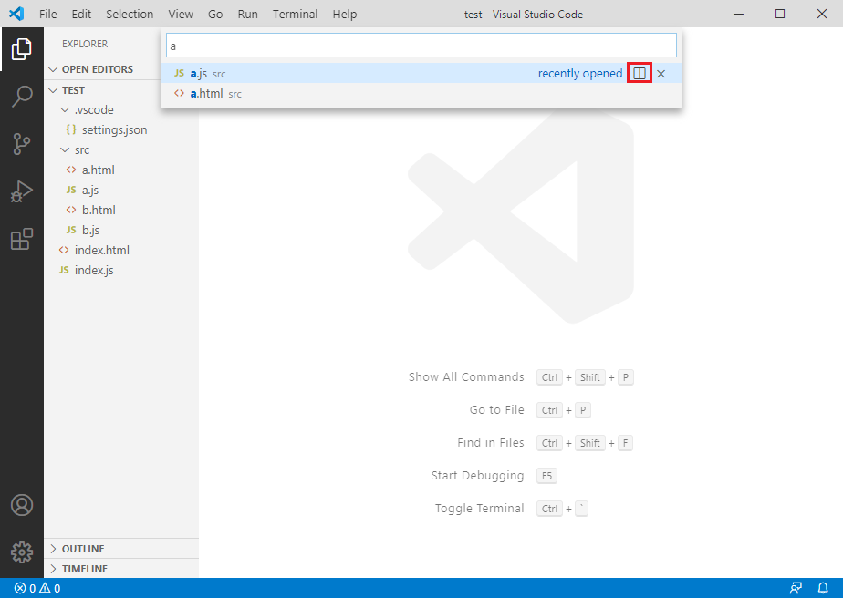 검색된 파일의 오른쪽 부분의 'Open to the side' 버튼(화면에 빨간색으로 표시된 아이콘)을 클릭하면