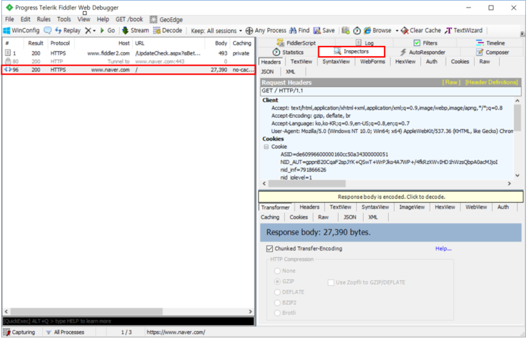 버프슈트와 같이 리퀘스트를 일시적으로 잡은 뒤, 해당 리퀘스트의 여러가지 정보를 조회/수정 할 수 있다. 오른쪽 탭의Inspectors의 기능은 따로 설명하지 않겠다. 써보면 금방 알 것이기 때문에 ㅋ_ㅋ