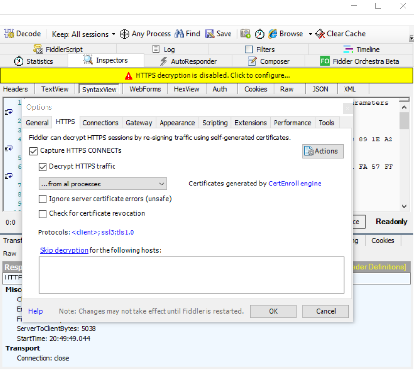 Tools -> Fiddler Options -> HTTPS -> Capture HTTPS CONNECTs 옵션만 켜주면 알아서 인증서 설치하고 알아서 MITM하여 HTTPS 패킷도 볼 수 있게 된다.