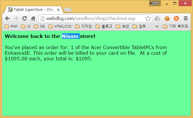 Composer때와 같이 AutoResponder로 수정된 패킷을 끌어다 놓고 rules를 키고 다시 한번 checkout.asp에 접속해본다.