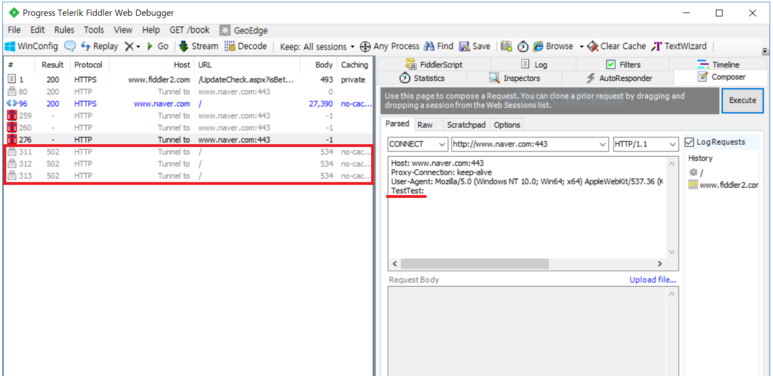 아까 잡았던 리퀘스트를 마우스 드래그를 통해서 Composer로 보낸다. 이후 내용을 수정도 가능하다. 오른쪽 상단의 Execute를 누르면 반복적인 요청을 보낸다.