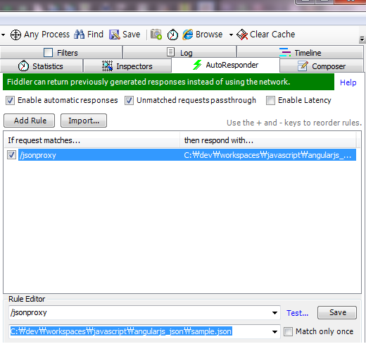 RuleEditor에서 /jsonproxy 라는 URL로 설정해놓으면, 모든 사이트로 가는 Request에 대해 /jsonproxy라는 URI를 가지면 모두 이 Rule을 적용 받는다.