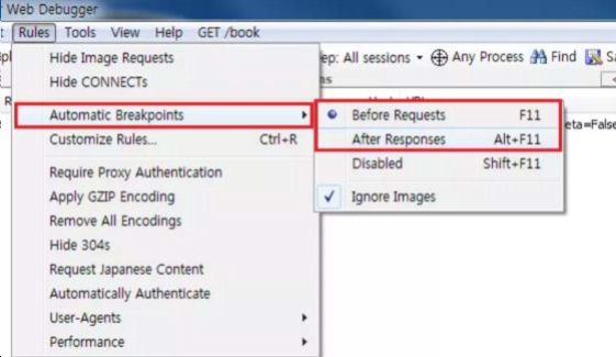 두번째 상태인 After Responses는 HTTP Response가 서버에서 돌아와 브라우저에게 가기전에 Fiddler에서 Response 데이터를 조작하거나 Drop 할 수 있다.