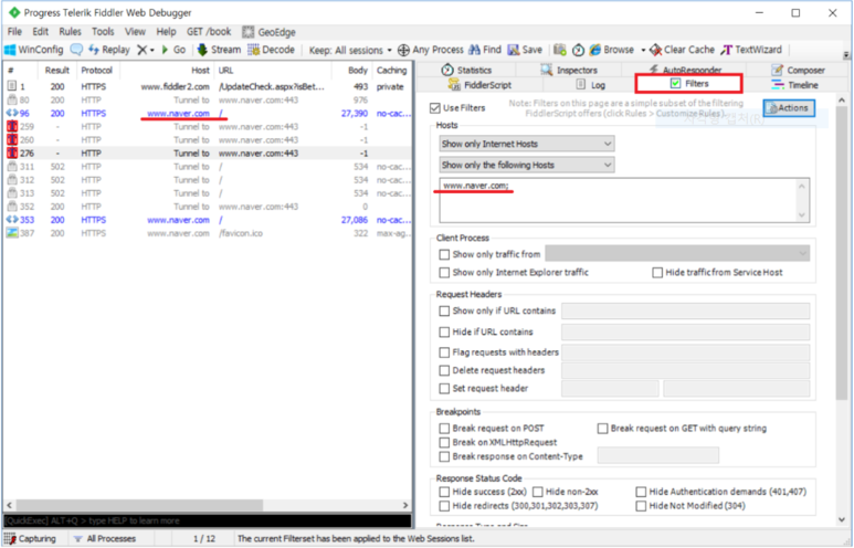 네이버에 관련된 세션을 보기위해 naver.com을 입력하면 네이버에 관련된 세션들만 마킹되어 알아보기 쉽다.