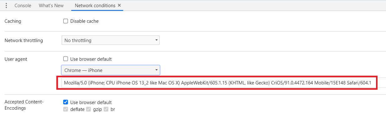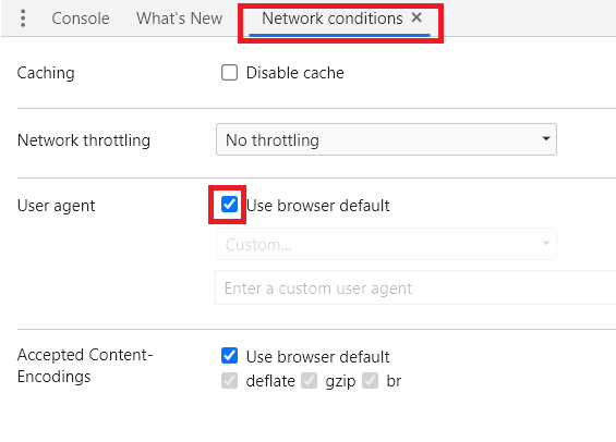 하단에 Network conditions 탭이 추가되었다. Use browser default의 체크를 해제한다.