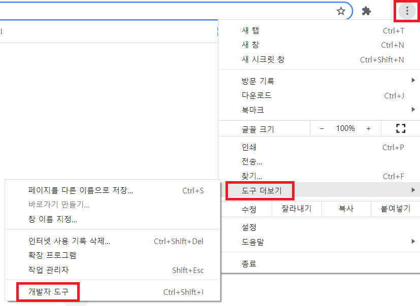 크롬 브라우저에 접속하여 우측 상단의 세 점 아이콘을 클릭한다. 이후 도구 더보기 -> 개발자 도구를 클릭한다.