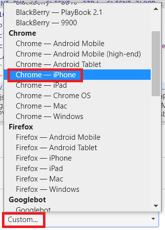 그러면 Custom 드롭다운 메뉴가 활성화된다. 이 중에서 Chrome - iPhone을 선택한다.