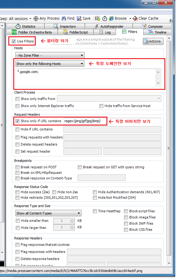 피들러가 구동되면 모든 프로세스의 HTTP/HTTPS 트래픽을 가로채므로 여러 개의 웹 브라우저가 실행중이라면 굉장히 많은 HTTP 트래픽이 표시되어 화면이 너무 복잡해질 수 있습니다.