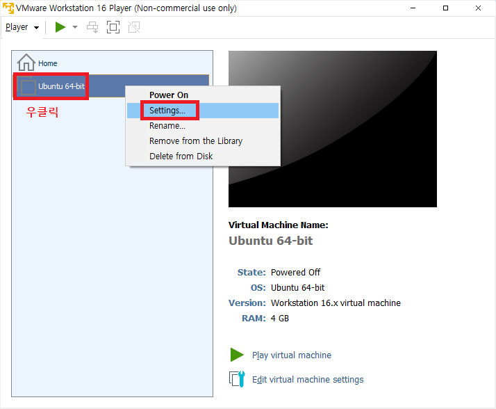 VMware를 실행하고 사용하는 가상머신에 우클릭 -> 세팅을 들어갑니다.