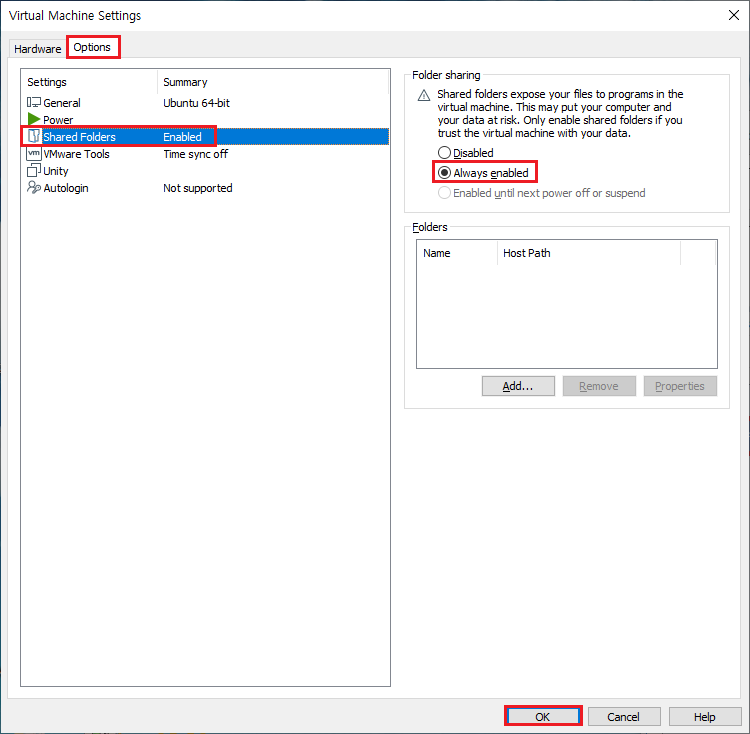 가상머신 세팅창이 나왔으면 Option -> Shared Foleders -> Disabled를 체크해제하고 Always enabled를 체크해주고 OK를 누르면 끝입니다.