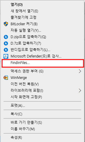 탐색기에서 검색하고자하는 폴더에서 우츨릭을 하여, FindInFiles 선택합니다.
