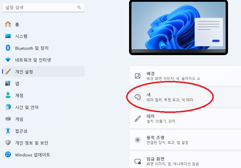 ▼ 개인 설정 창으로 이동하면 오른쪽 화면으로 가서 색 항목을 찾습니다.