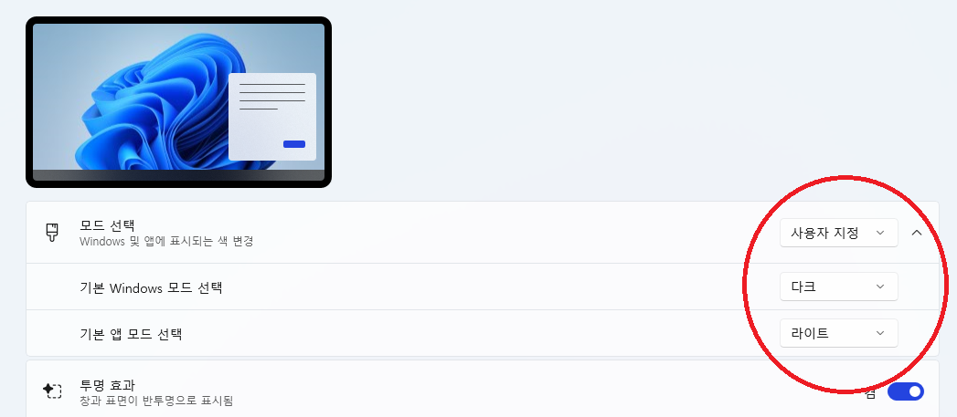 “기본 Windows 모드 선택” 을 다크로 하고 “기본 앱 모드 선택” 을 라이트로 해 보았습니다.
