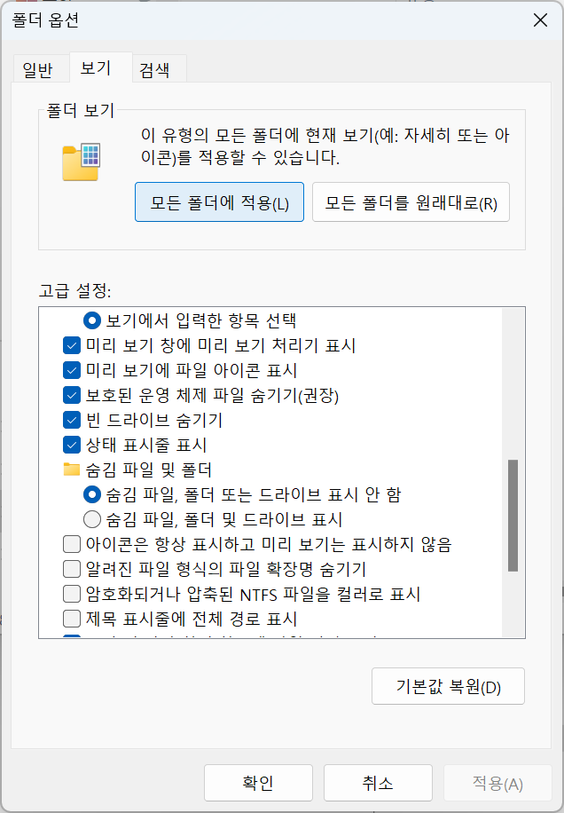 이렇게 변경된 세부 정보는 해당 폴더만 적용됩니다. 만약 파일 탐색기를 통해 열어본 모든 폴더에서 동일한 세부 정보가 표시되도록 설정하고 싶다면, 탐색기 상단 메뉴에서 [보기 > 옵션] 클릭 후 "폴더 옵션" 창이 열리면 [보기] 탭의 "폴더 보기" 섹션에서 [모든 폴더에 적용(L)] 버튼을 클릭하면 됩니다.