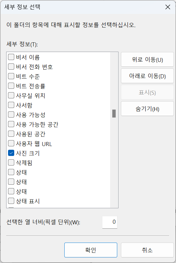 이미지 파일이 저장된 폴더라면 [사진 크기] 항목을 선택하여 이미지를 직접 실행하거나 속성 정보를 보지 않고도 이미지 해상도를 확인할 수 있습니다. 다만 동영상의 경우 [자세히(M)] 항목을 선택하여 세부 정보를 추가해야 합니다.