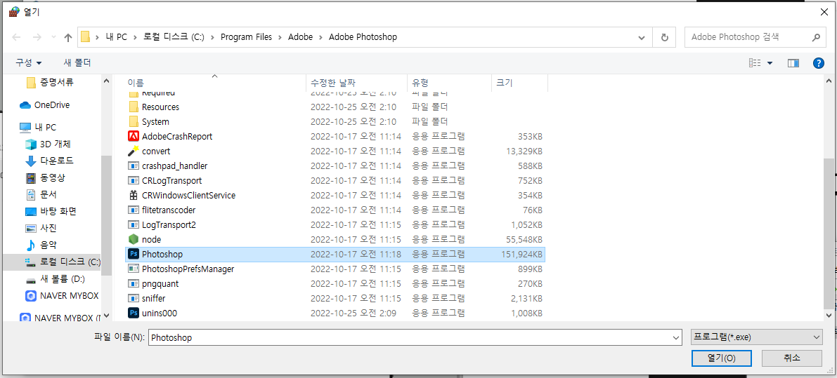 저는 C:\Program Files\Adobe\Adobe Photoshop\ 에 있는 Photoshop.exe 파일을 지정해주었습니다.