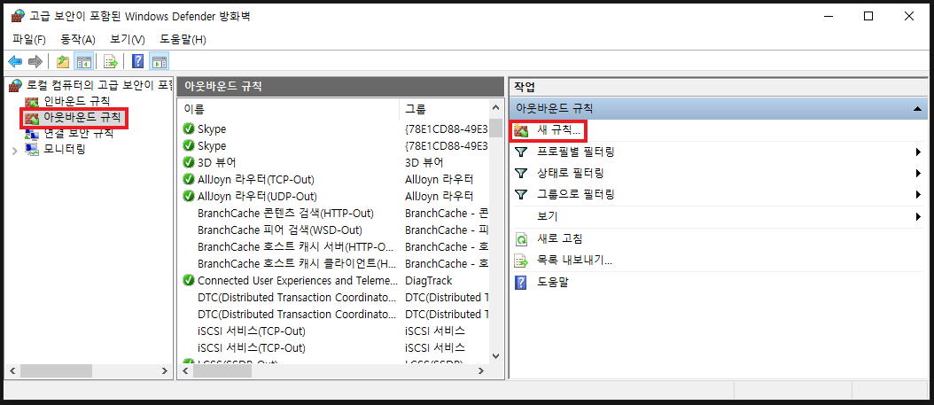 [고급 보안이 포함된 Windows Defender 방화벽]에 진입하시게 되면 좌측에 있는 아웃바운드 규칙을 누르시고 우측 작업칸에 있는 새 규칙을 눌러줍니다.