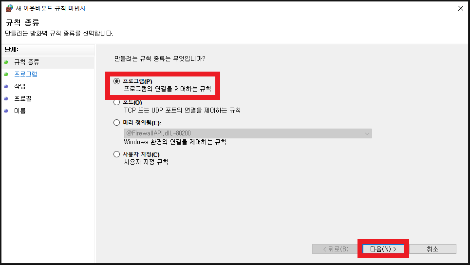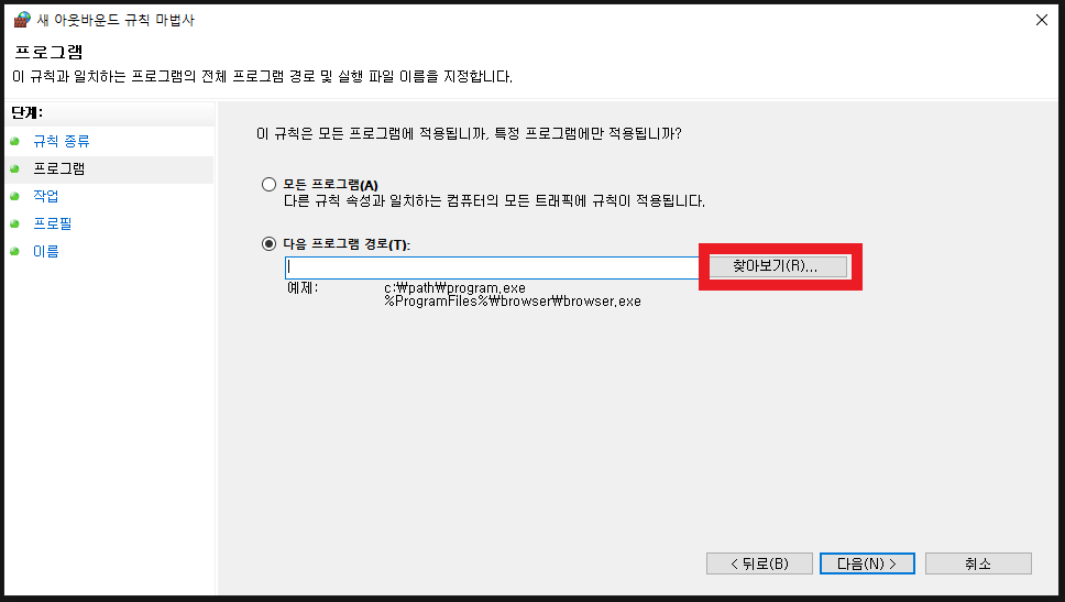 netsh advfirewall firewall add rule name="규칙이름" dir=in program="실행프로그램 경로" action=block profile=private,domain,public enable=yes