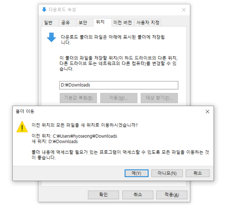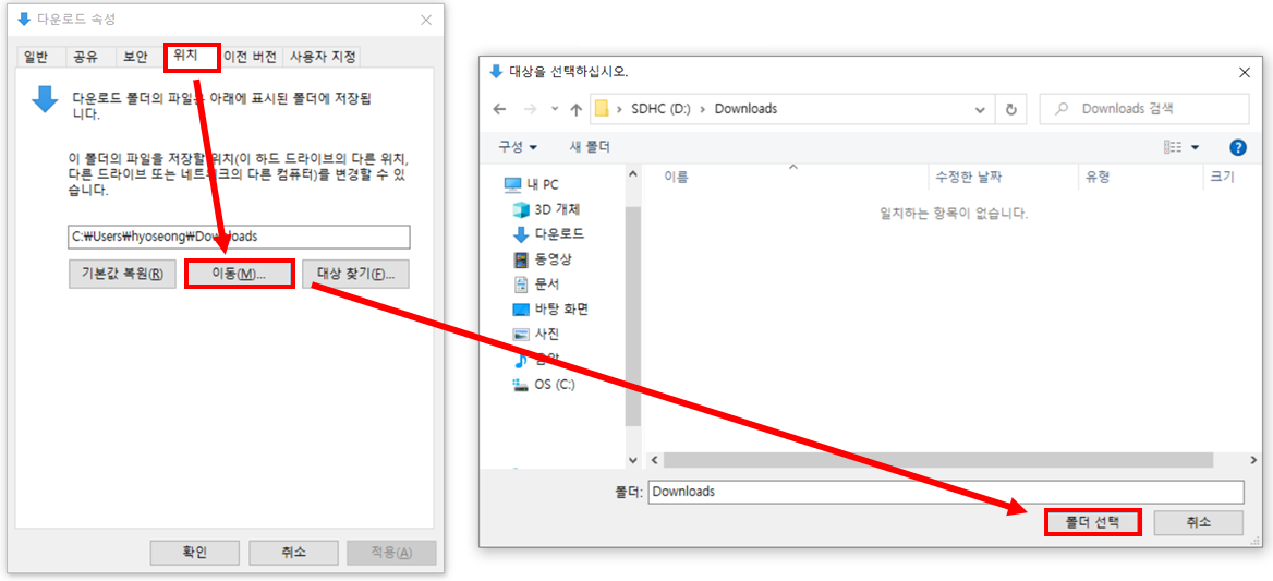 다운로드 폴더의 속성으로 갔다면, 위치 탭으로 이동 후 "이동"을 클릭하여 원하는 폴더를 선택합니다.