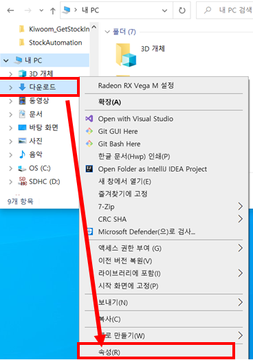 그 후 내 PC 하단의 다운로드 폴더를 클릭해 보시면 변경된 위치로 이동된 것을 확인하실 수 있습니다.