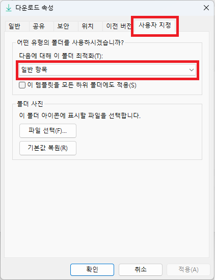 그럴 때는 해당 폴더 우클릭 후 '속성' > '사용자 지정' > '다음에 대해 이 폴더 최적화 항목'에서 일반 항목을 선택합니다.
