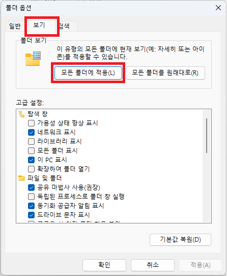 '보기' 탭에서 '모든 폴더에 적용' 항목을 선택 합니다