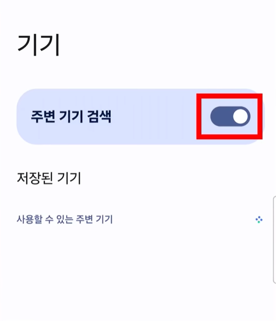 4. '주변 기기 검색' 항목 오른쪽의 활성화된 파란색 버튼을 눌러 회색(비활성화)으로 바꿔줍니다.