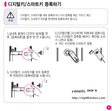 사용 설명서에서 실내 본체의 등록 버튼을 짧게 누르면 디지털 키 수신기에 사용할 스마트 키와 등록 할 스마트 폰을 차례로 터치 한 후 실내 본체의 등록 버튼을 다시 누릅니다. 등록이 완료되었습니다. 여기서 중요한 점은 등록 할 때 이전에 등록한 키가 삭제되고, 사용할 스마트 키와 NFC 카드를 한번에 등록해야한다는 점입니다.