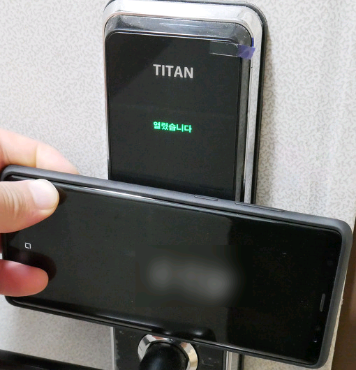 이제 잘 열리는 지 확인해 봅시다. 화면이 꺼지고 리시버가 스마트 폰에 닿으면 문이 열리고 울리는 소리가납니다. 와 ~~~~~~~~~~~~~~~ 처음으로이 도어록을 사용하는 것이 무서워 .. ㅎㅎ 방금 들었던 스마트 폰으로 도어록을 열 수 있다는 게 정말 놀랍습니다 전에.
