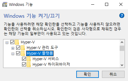 화면에서 아래 이미지와 같이 Hyper-V 항목을 선택하고 "확인"을 클릭합니다.