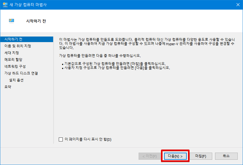 새 가상 머신 마법사 창이 나타나고 자세한 가이드가 나타납니다. 사용자 지정 구성으로 만들고 있으므로 다음 버튼을 누릅니다.