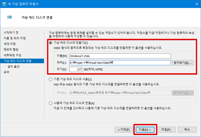 외부 하드 디스크 또는 다른 하드 디스크에 저장하지 않는 한 기본 가상 하드 디스크 생성 옵션으로 다음 버튼을 클릭합니다.