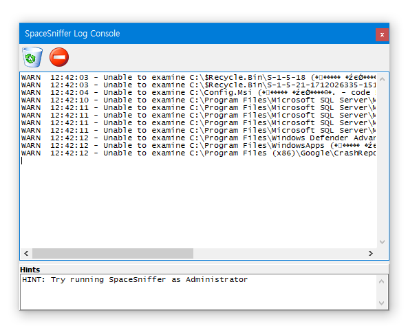 드라이브를 분석하는 동안 로그 (SpaceSniffer 로그 콘솔)가 나타납니다. 로그에 약간 깨진 것처럼 보이는 문자가 있지만 오류가 아니므로 신경쓰실 필요가 없습니다.